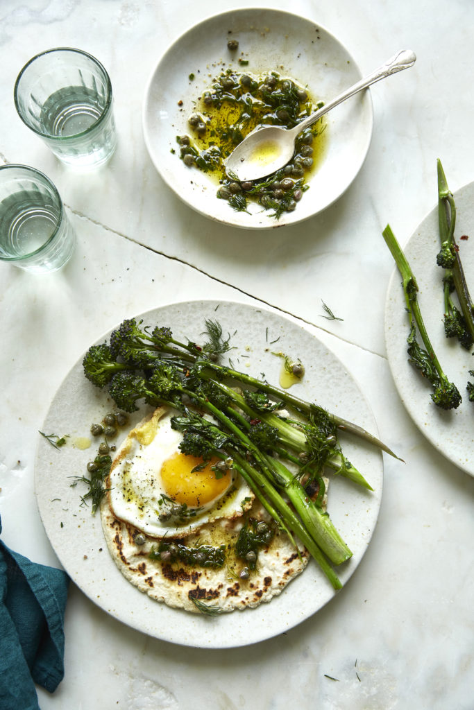 Broccolini and Fried Egg Tostadas with Caper Vinaigrette
