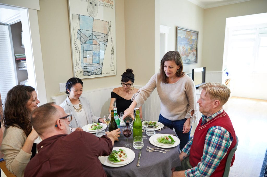 Doesn’t it look welcoming? Here you can see the space can easily handle a crowd of GFF contributors (left to right: Erin Ng, Eric Lundy, Emma K. Morris, Alanna Taylor-Tobin, and Eric’s husband Barry Lipscomb, and me–this was for our holiday dinner party shoot in our Holiday 2018 issue). I’m sitting on a leather ottoman also from Room & Board. I have two of them that I pull out when I need extra seating; when I don’t, they are pushed together as a comfy bench against a wall, but also make a great extra coffee table or surface for GFF Instagram posts.