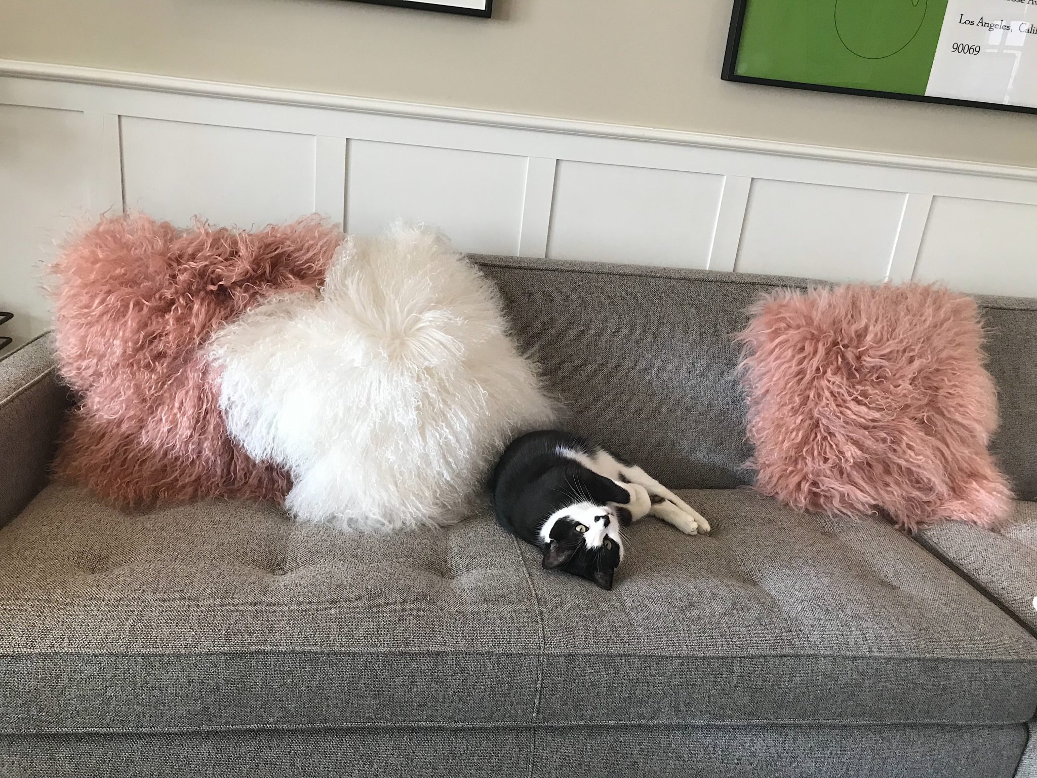 My vintage chair (where Mama is lounging) and side table are now joined by a new sectional couch and coffee table from Room & Board. I do a lot of my writing on the couch, so I appreciate its structure, which gives my back support while I sit upright but also welcomes sprawling for nighttime TV. Because the couch is on legs, it creates an airier feeling, as does the coffee table, thanks to its rounded edges and glass top. I invested in special double-sided tape to temporarily put on the corners of my couch to prevent my cats from thinking they are new, luxury scratching posts. 🙂