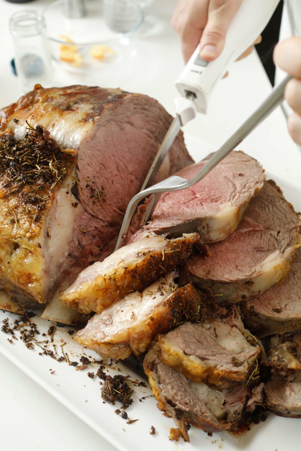 - 1 (8-pound) bone-in prime rib roast, with its fat cap, sliced partially from the bone, tied