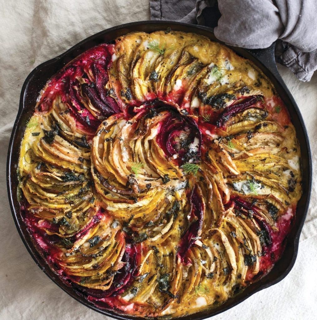 Plant-Based Gratin with Beet and Fennel and Mint-Coconut Cream Sauce