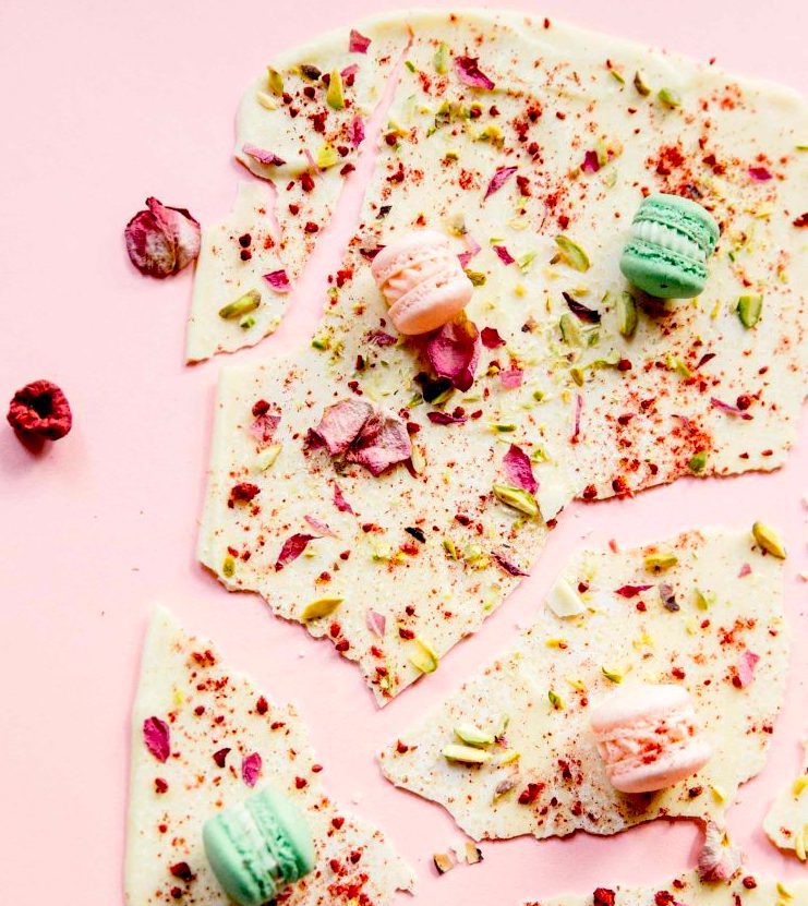 The beauty of white chocolate bark, besides the fact that it’s so yummy, is you can make it in minutes and garnish it with whatever you want. This recipe includes pistachio, rose petals, ground dried raspberry, and the occasional macaron (buy or make your own), but you can top yours with essentially anything you like. Get the recipe