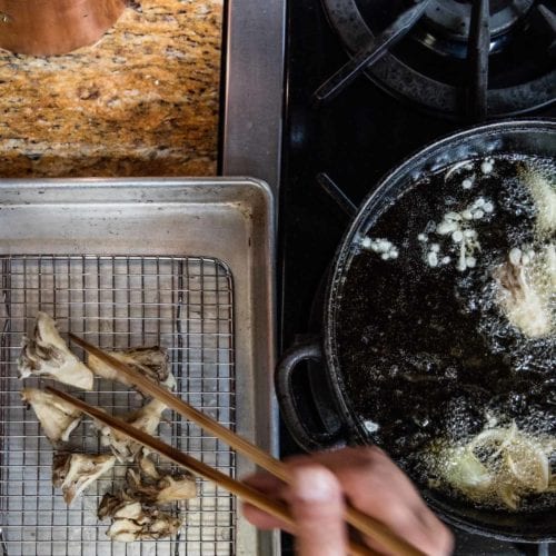 Line a sheet pan with paper towels. Working in batches, dip the mushrooms and onions in the batter to lightly coat, then gently place them one at a time in the oil. Do not overcrowd the pan or the oil will lose its heat. Cook for about 20 seconds, turn over and cook for another 20 seconds, then remove with a slotted spoon and drain on the paper towels.