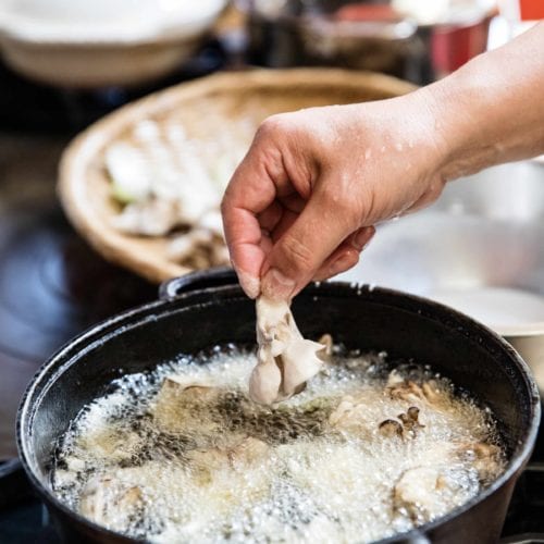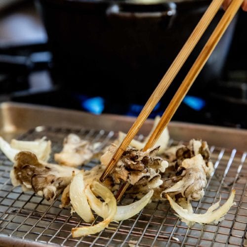 Perfect gluten free tempura doesn’t get any easier than this stovetop recipe by famed Napa Valley chef Hiro Sone. Here, we are all about mushrooms and onions. But you can easily dip and fry 1⁄4-inch-thick slices of pumpkin, sweet potato, or zucchini and whole shrimp or asparagus—or anything else your tempura-loving heart desires.