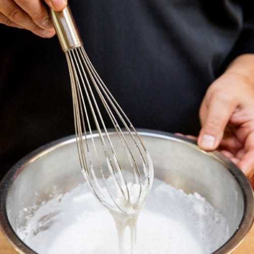 In a mixing bowl, combine the rice flour, cornstarch, baking powder, and a pinch of salt. Slowly whisk in the soda water a little at a time to achieve a light paste that lightly sticks to the mushrooms and onion when they’re dipped into it.