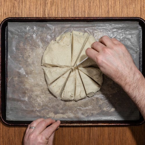 Turn out the dough onto one of the prepared baking sheets. Gently punch it down to deflate it, then cut the dough into 12 even pieces and cover them with a sheet of plastic wrap.