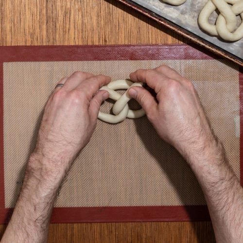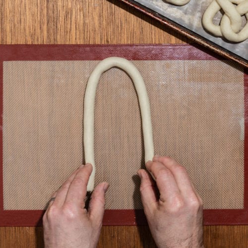 Then firmly press the rope into the bottom of the “U,” ensuring it’s moist enough to adhere to itself. If the dough isn’t staying smooth or is cracking when you shape it, lightly dampen your hands and roll the rope a few more times to coat it in light moisture. Place the shaped dough on the prepared baking sheets.