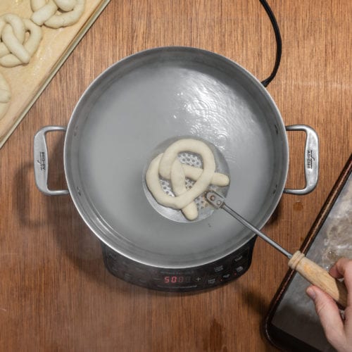 Return the water to a rolling boil, then one at a time, boil the pretzels. If the pretzels immediately float, boil for about 10 seconds, then, using a slotted spoon, return them to the prepared baking sheets. If they sinks, wait for them to float to the top of the water, then remove it. (Though if it’s sticking underwater for a while, it may be stuck to the bottom of the pan; you can gently coax it away with your slotted spoon.) Sprinkle the boiled pretzels very generously with pretzel or kosher salt.