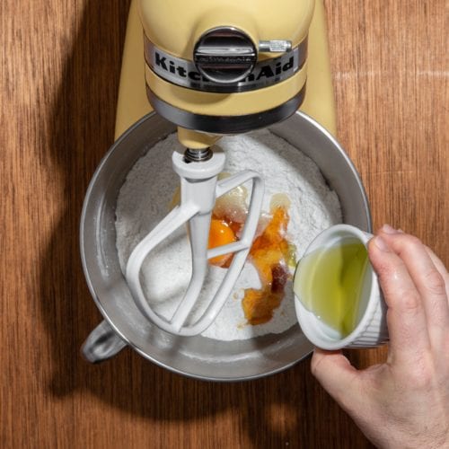To the bowl of dry ingredients, add the egg, honey, vegetable oil, and water-yeast mixture. Then mix on medium speed until a firm but not dry dough forms, 2 to 4 minutes. (It should be just barely sticky and moist enough to not get crackly when you knead it.) If the dough seems even slightly dry or crumbly, kneed in up to 2 tablespoons of water.