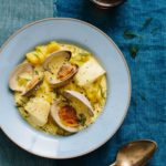 Here’s a tip for making this light-yet-decadent gluten-free seafood chowder: let the clams sit in a bowl of well-salted water in the fridge for at least one hour and up to several hours so they purge their sand, making it easier for you to prepare them.