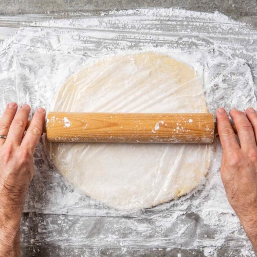 Working quickly, unwrap the chilled dough onto the flour-dusted plastic wrap. The dough will still be soft and sticky, but it should peel away from the plastic wrap easily. Generously dust the top of the dough with more tapioca flour. Cover the dough with another piece of plastic wrap, then, using a rolling pin, gently roll out the dough between the two pieces of plastic wrap to form a 13 by 10-inch rectangle.