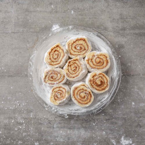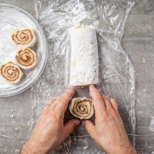 The dough is extremely soft and sticky, so be sure to follow the directions for the tidiest results, and make sure the butter for the filling is very soft. There are no redos in this rollup, so don’t try to unroll and roll again. If you don’t love the look of your rolls, grease and flour a cupcake tin and bake the rolls individually for single-serving deliciousness that looks and tastes great no matter what! Note: this recipe calls for dental floss for easy slicing; if you don’t have any, use a clean, sharp knife to cut the dough, wiping clean between cuts. Cinnamon rolls are best the day they’re baked but are also delicious kept covered at room temperature and enjoyed the next day. You can also freeze uncooked or cooked rolls wrapped in plastic wrap. Make Ahead: You can refrigerate unbaked cinnamon rolls, sliced and placed in their pie plate, covered in plastic wrap, the day before you want to cook them. To bake, bring them to room temperature for 30 minutes, then bake, following the recipe directions.