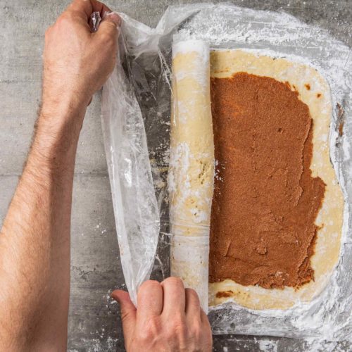 Roll up the dough: Starting on a shorter side of the rectangle, gently, slowly roll the dough into a tight log, using the plastic wrap to help lift and roll. If the dough begins to tear, dust your fingers with tapioca flour, then gently detach the dough from the plastic wrap and keep going. With a clean knife, slice off the ends of the roll to create clean edges.