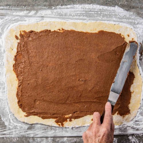 Spread the filling: Place dollops of the filling over the dough. Using a knife, spatula, or the back of a spoon, very gently spread the filling mixture over the dough until it is 1 inch from the edges of the dough. If it’s difficult to spread, don’t worry; just spread the dollops as best you can.