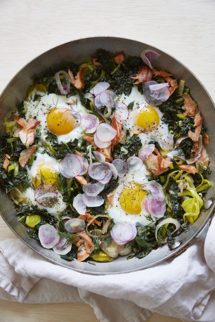 Baked Eggs with Caramelized Onion, Kale, and Smoked Salmon