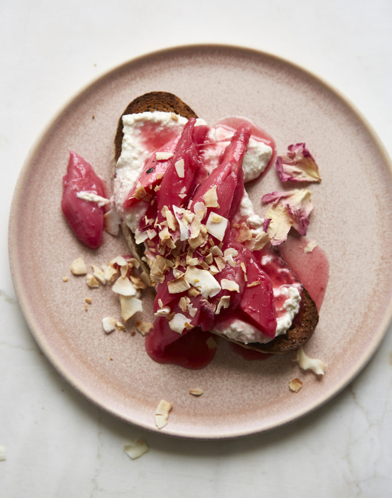 Orange-Honey Poached Rhubarb with Cashew Cream on Toast