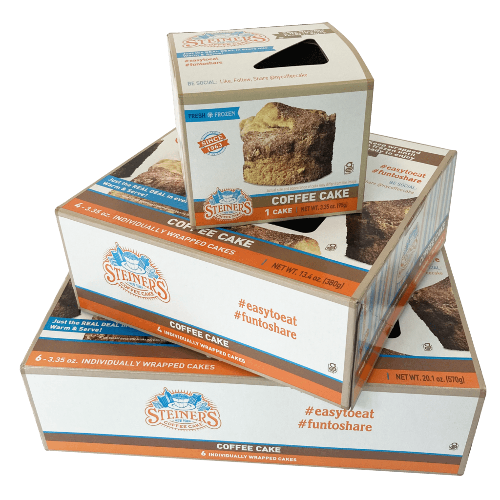 Put the coffee on and get ready to try the perfect accompaniment to your steaming cup of joe. Steiner’s Coffee Cake of New York coffee cakes are the perfect cross between a cinnamon roll and a muffin–moist yellow cake ribboned with warm cinnamony spices and sweetness. Think “perfect for holiday morning” or any morning for that matter. Each generous cake is single-serving and wrapped for freshness and easy transport.