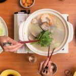 Ask guests to take a serving of dipping sauce and season it with Momiji Oroshi and chives and then invite them to pick out from the cooked food in the pot, dip it in the sauce, and eat it. Be sure to watch the pot, skim any foam from the surface, and continue to add broth, vegetables, and seafood slowly to keep the pot full and hot.