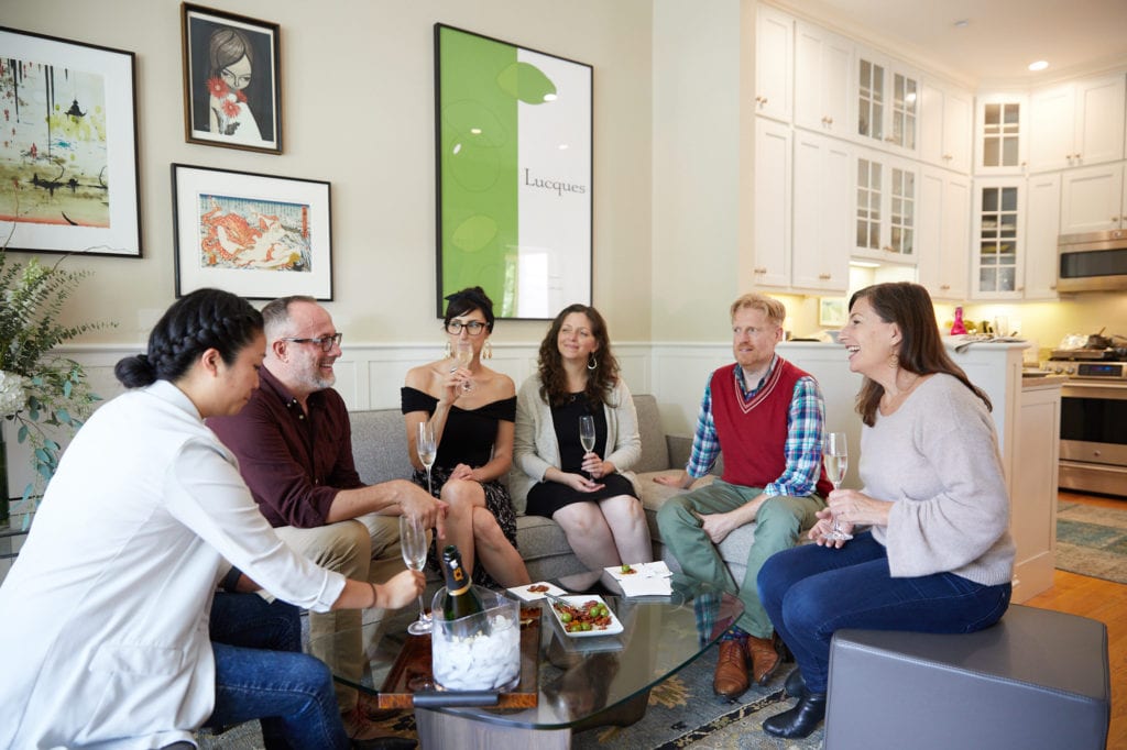 Doesn’t it look welcoming? Here you can see the space can easily handle a crowd of GFF contributors (left to right: Erin Ng, Eric Lundy, Emma K. Morris, Alanna Taylor-Tobin, and Eric’s husband Barry Lipscomb, and me–this was for our holiday dinner party shoot in our Holiday 2018 issue). I’m sitting on a leather ottoman also from Room & Board. I have two of them that I pull out when I need extra seating; when I don’t, they are pushed together as a comfy bench against a wall, but also make a great extra coffee table or surface for GFF Instagram posts.