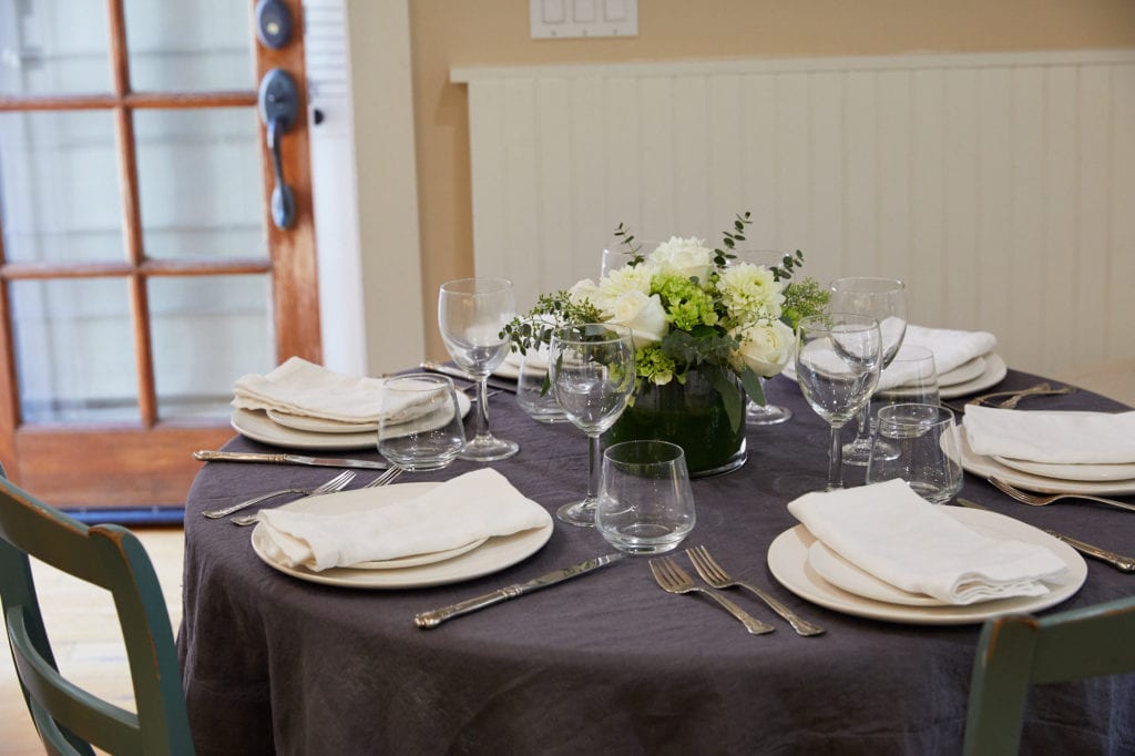 In the kitchen, the linen tablecloth by Rough Linen elevates the environs and is durable–thank goodness, because we’re messy eaters! The silver is my mom’s, and the matte white plates are from CB2; they’re good for shooting food because they’re less reflective. If you live in San Francisco and need flowers, I strongly recommend Laurel Designs; she’s my go-to for every occasion.