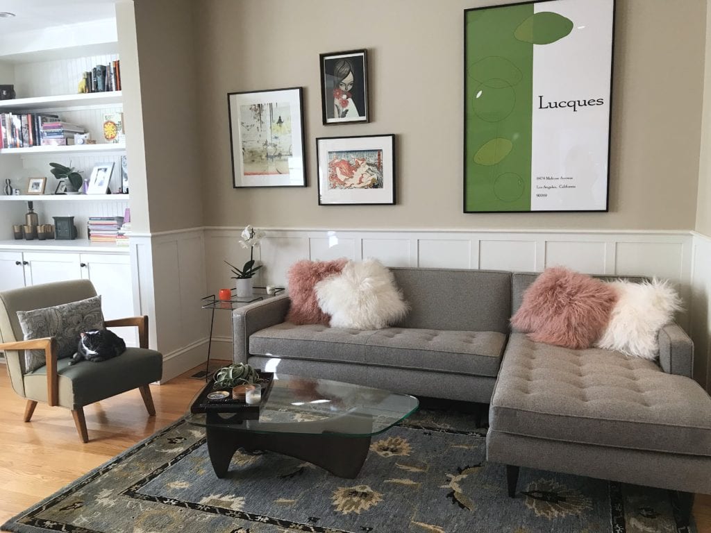 My vintage chair (where Mama is lounging) and side table are now joined by a new sectional couch and coffee table from Room & Board. I do a lot of my writing on the couch, so I appreciate its structure, which gives my back support while I sit upright but also welcomes sprawling for nighttime TV. Because the couch is on legs, it creates an airier feeling, as does the coffee table, thanks to its rounded edges and glass top. I invested in special double-sided tape to temporarily put on the corners of my couch to prevent my cats from thinking they are new, luxury scratching posts. 🙂