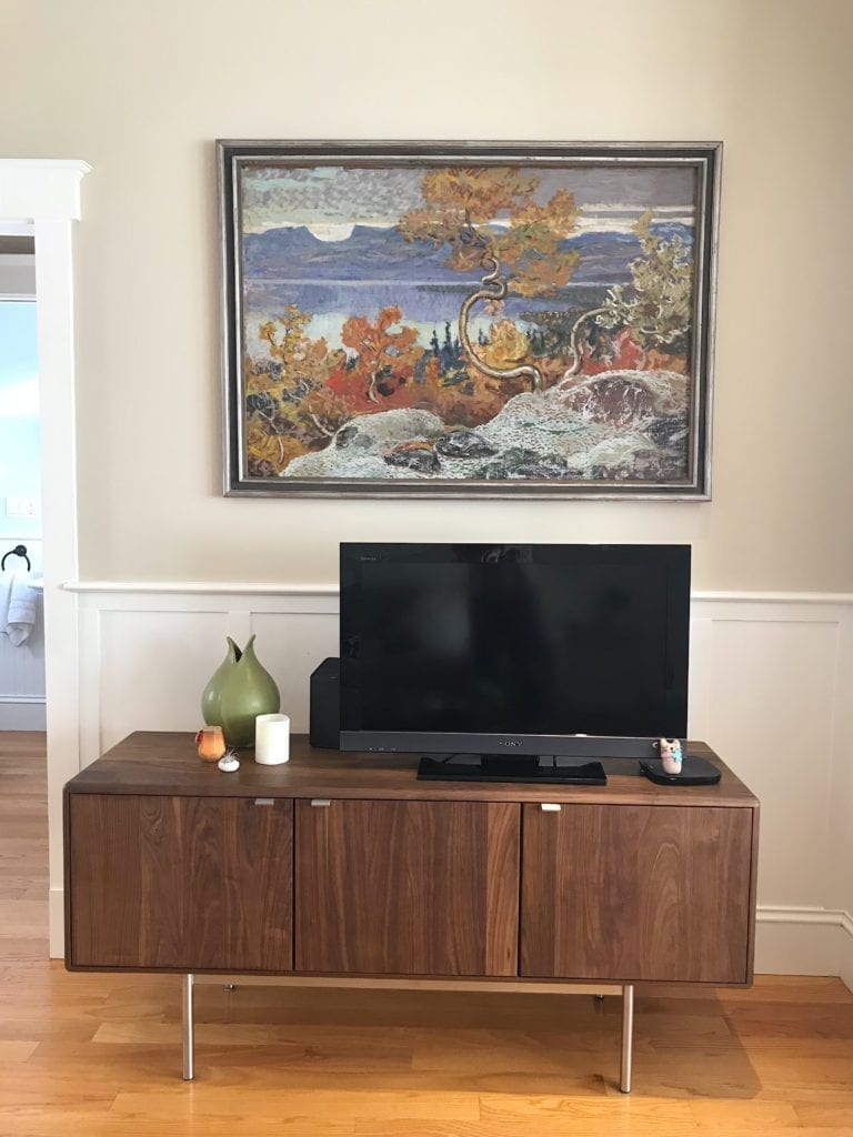 I hate the way TVs look, so I only have a small one. Plus, the Room & Board media cabinet it sits on and the art above it (a gift from my dad) are so pretty, I hope the TV is barely noticed.