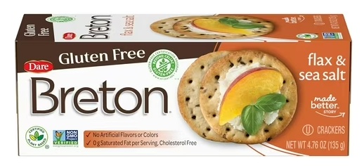 These wholesome, almond-flour crackers do the trick as a currier for cheese or spread or even a stand-along munchable snack and come with 3 grams of protein per serving. They resemble off-limits Wheat Thins in appearance, but have a lingering garlic-onion aftertaste; certified GF, non-GMO, grain-free, paleo-friendly, kosher; contains almonds; amazon.com or store locator