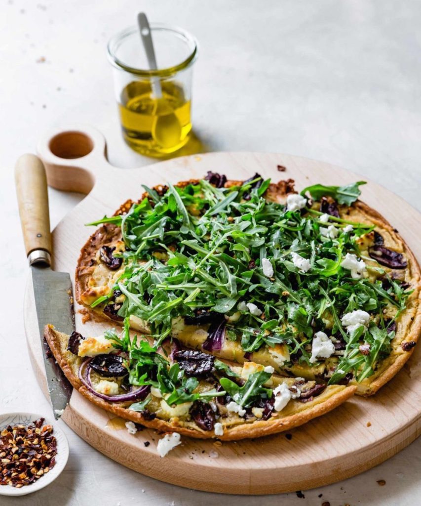 Chickpea Flour Flatbread with Arugula, Red Onion, Goat Cheese, and Olives