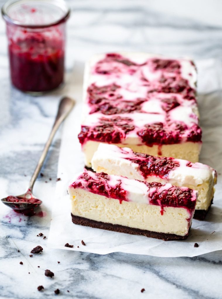 This creamy, tangy cheesecake is made in a loaf pan, so it’s the perfect size for an intimate gathering, with leftovers you’ll be glad you have. Besides, you’ll learn how to make a fantastic GF chocolate crust, classic cheesecake filling, and tart sour cream topping combined with bright swirls or raspberry chia jam. Hello lover! Get the recipe