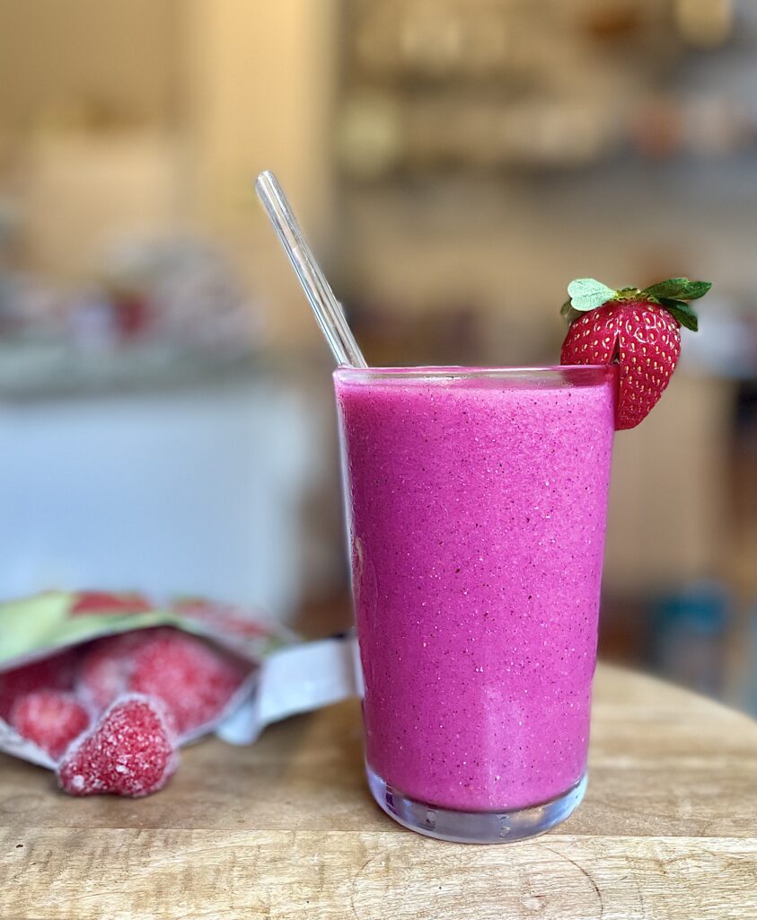 I go through phases when I forget how much I love smoothies. Then I make one again and am back on a smoothie kick. For this drink, I combine a banana with frozen berries — usually a strawberry-blueberry combo — some chunks of frozen dragonfruit, and about a half cup of water. Often, I’ll add GF protein powder or some magnesium powder. In either case, it’s antioxidant-rich perfection! And yes, we use glass straws, which I clean with a cute little straw brush. You can find those and more things we love at our Amazon store.