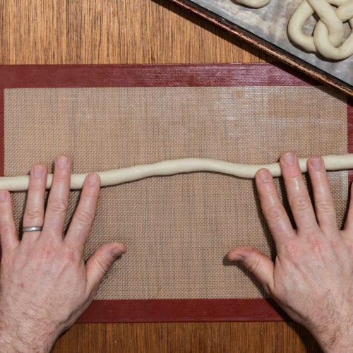 Working one at a time and quickly so the dough doesn’t dry out, kneed a piece of dough until completely smooth, then using your hands, roll it on the silicone mat into a long, even rope about 15 inches long. The dough should be moist and slightly sticky. If it’s not, kneed in a half teaspoon of water and roll it out again.