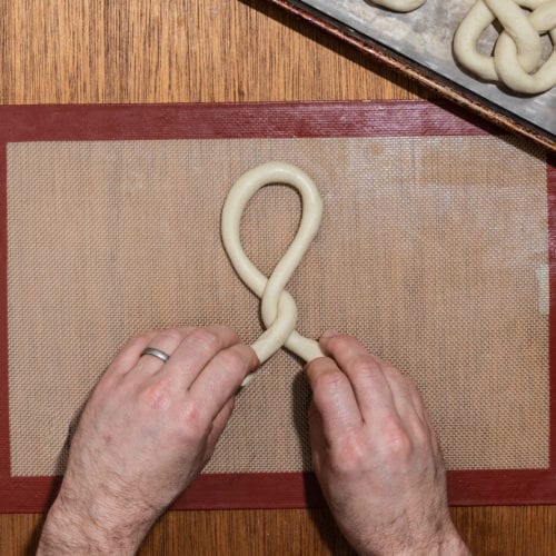 Then firmly press the rope into the bottom of the “U,” ensuring it’s moist enough to adhere to itself. If the dough isn’t staying smooth or is cracking when you shape it, lightly dampen your hands and roll the rope a few more times to coat it in light moisture. Place the shaped dough on the prepared baking sheets.