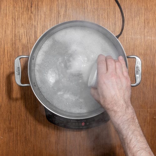 Prepare the cooking water: Turn off the heat under the boiling water. Slowly add the baking soda and sugar to avoid the baking soda reaction from causing the water to overflow.