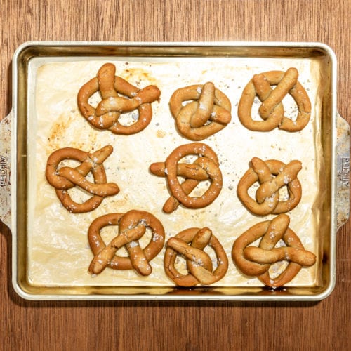 This dough is surprisingly easy to work with, and you can even shape and cook it into mini- or regular-size bagels, though they will be pretzel-flavored bagels 🙂 For bagels, just make sure to boil bagel-shaped dough for 2 minutes before draining them and baking them at 450°F for about 20 minutes. Pretzels are the most moist and tasty the day they’re made, but you can freeze them once they’re cooled, store them in a ziplock bag, and then reheat them in a warm oven if you want to eat them later.