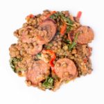 - 1- pound smoked gluten-free pork, chicken, turkey, or vegetarian sausage, cut diagonally into ½-inch-thick disks