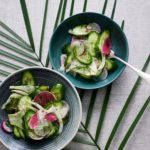 In a colander, combine the cucumbers, radishes, fennel bulb, salt, and sugar. Toss until very well combined. Let drain into the sink or a bowl for 15 minutes, firmly pushing down on the vegetables every few minutes to release more of their liquid.